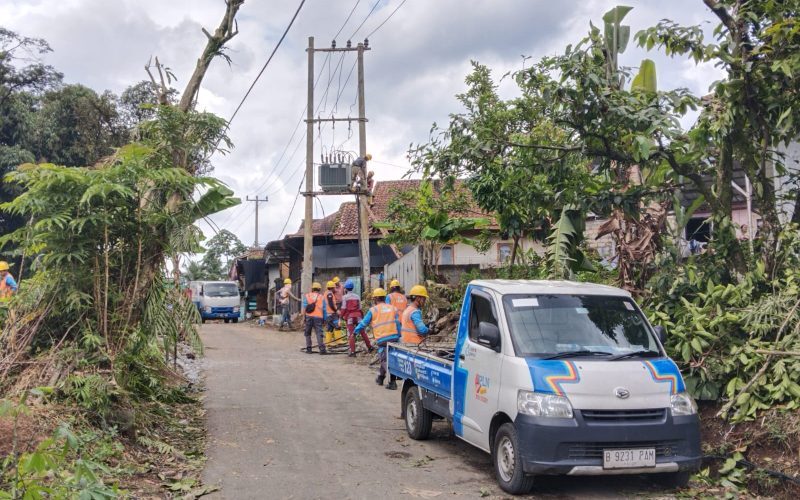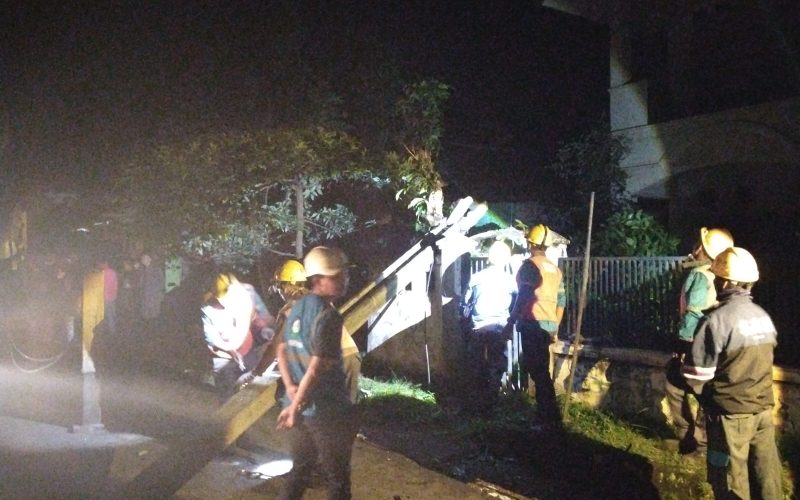 PLN UPL Leuwiliang Evakuasi Tiang Listrik roboh melintang menutupi akses jalan